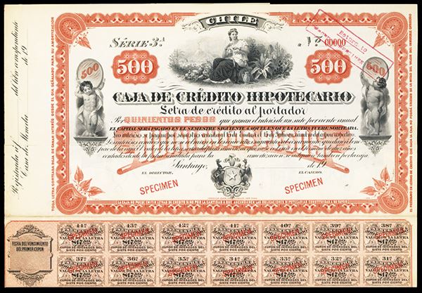 Chile, 19xx, (ca.1900-1920), 500 pesos, Specimen Bond, Rust Border with Allegorical Figure and Cherubs, Coupons Attached, POC, XF.