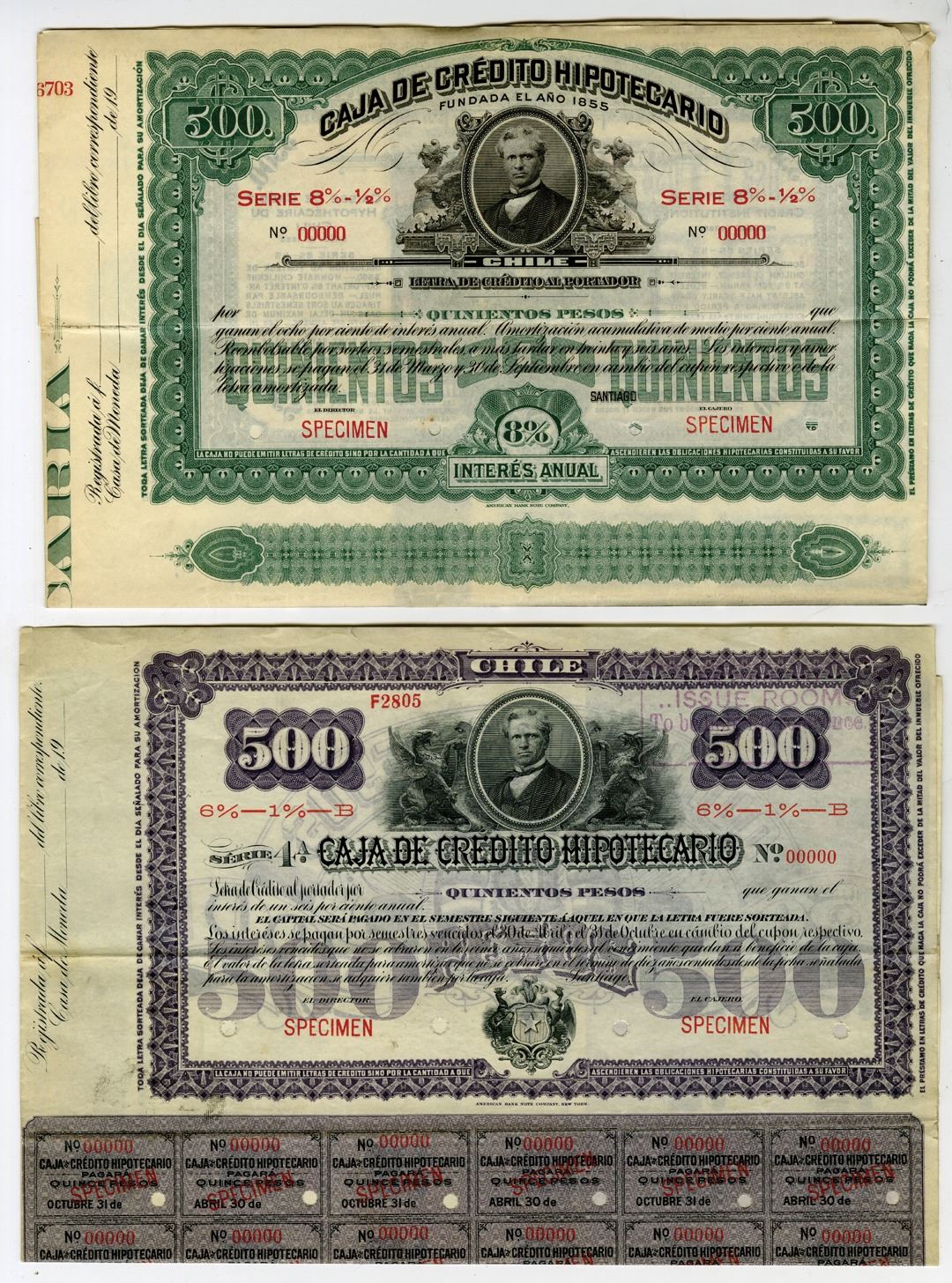 Santiago, Chile, ND (ca.1900s). Lot of 2 Specimen Bonds, Includes: 500 Pesos 8% Specimen Coupon Bond, Black on green border and underprint; 500 Pesos 6% Specimen Coupon Bond, Black on purple border and underprint. Both pieces have Specimen overprints and POCs, ABNC. (2). Sold "AS IS" no returns accepted.