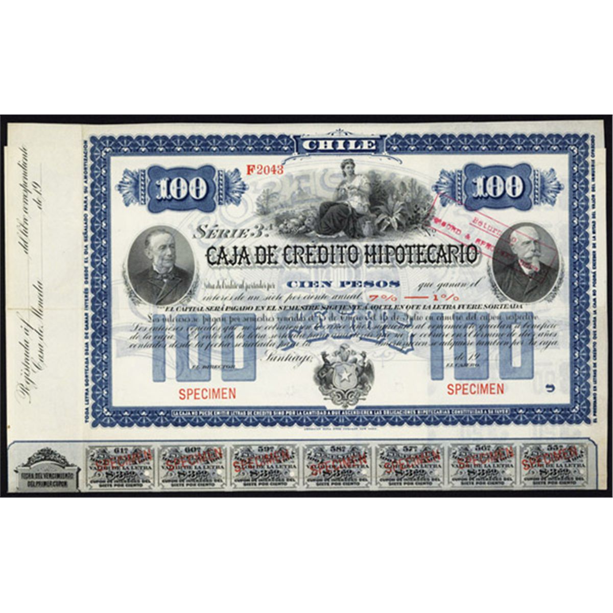 Santiago, Chile, 19xx (ca. 1900-1920), 100 Pesos, Specimen bond, Woman with tropical plants, male portraits, Blue, ABNC, POC's, XF.