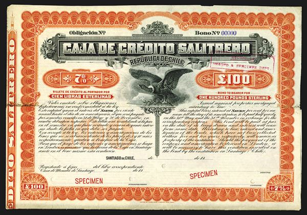 Santiago, Chile. 19xx (ca.1900-1909), 100 Pounds Sterling, 7%, red border and underprint with condor. Coupons attached, VF, Specimen and "00000" serial numbers, POC's, ABNCo. Scarce and attractive bond.