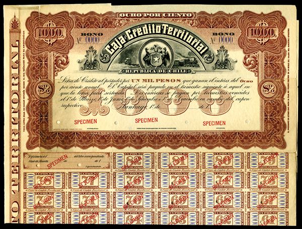 Caja De Credito Territorial, ca.1890-1900, Specimen Bond. Santiago, Chile, 1000 Pesos, Specimen 8% Coupon Bond, brown border and underprint with Chile Arms in middle top, specimen overprints, POCs, ABNC, Fine condition with archivally reinforced edge splits condition. Rare bond.