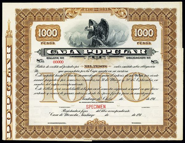 Santiago, Chile, 191x (ca.1900), 1000 Pesos, 8% Specimen Bond, Coupons attached, Black on brown border and underprint with condor vignette top center, VF condition, POC's, ABNC. Scarce and attractive bond.