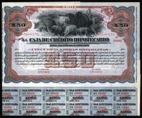 Santiago, 19x , œ50. Sereis 4A 6%-1% bond, Lilac and m/c border with cattle and sheep vignette. ABNCo. Specimen with coupons, EF, back has text stating that the bond's coupons that are not redeemed within 5 years will be confiscated by the Caja.