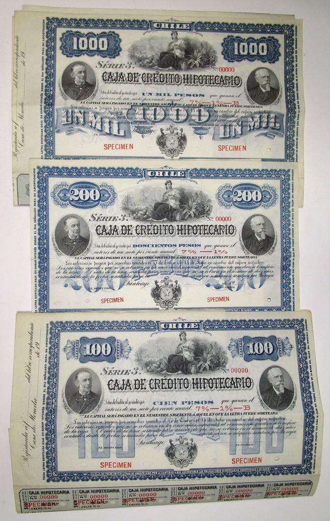 Santiago, Chile, ND (ca.1900-1910). Lot of 4 Series 3A Specimen Bonds, Includes: 100 Pesos 7%-1%-B Coupon Bond; 200 Pesos 7%-1% Coupon Bond; 500 Pesos 7%-1% Coupon Bond; and, 1000 Pesos 7%-1%-B Coupon Bond. All bonds have black on blue border and underprint, Specimen overprints and POCs, are in VF condition, and printed by ABNC. (3). Sold "AS IS" no returns accepted.