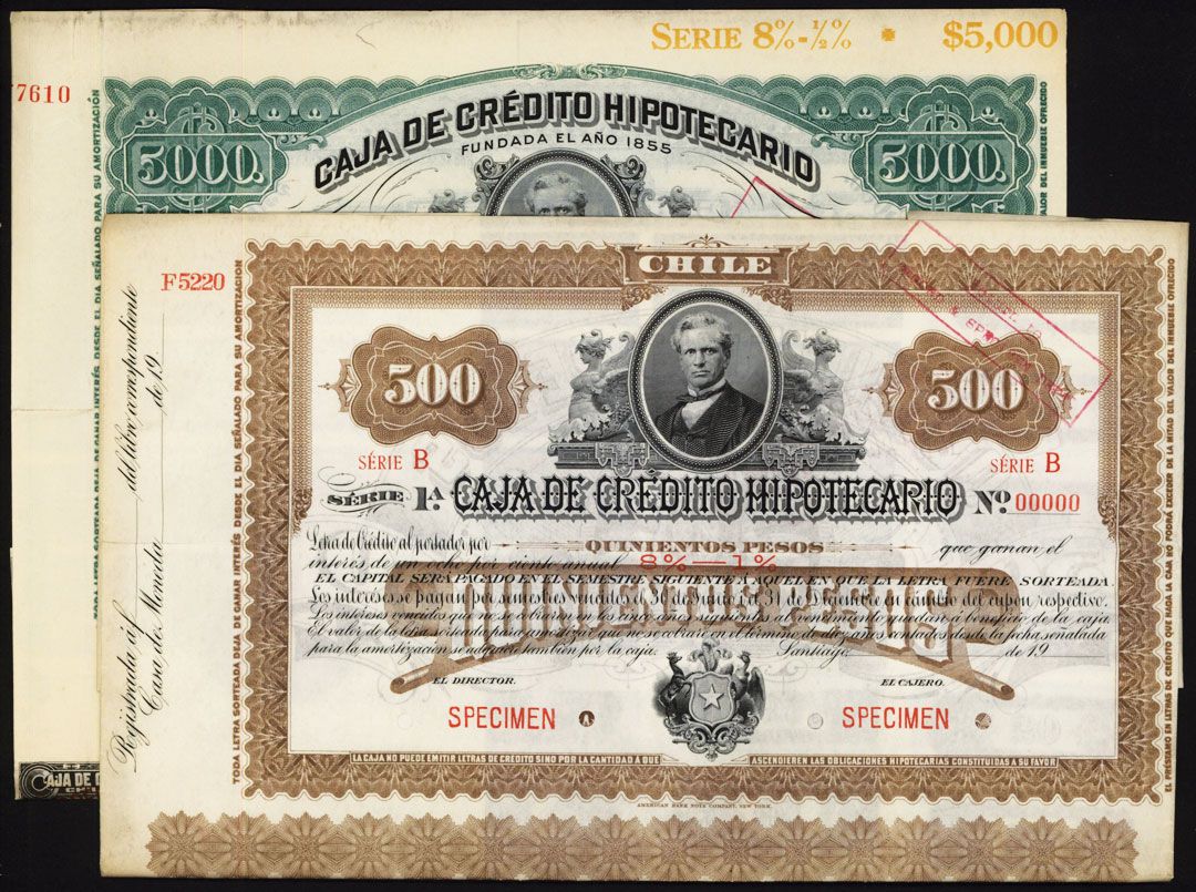 Santiago, Chile, 19xx. (ca.1900-1920), Lot of 2 specimen bonds, both with portrait of distinguished gentleman flanked by angels and coupons attached, 500 Pesos, Series B, Brown border and underprint, with Arms at bottom, coupons attached; 5000 Pesos, Series 8-1/2%, green border, Specimen overprints, POC's, VF-XF, scarce Chilean bonds. ABNC.