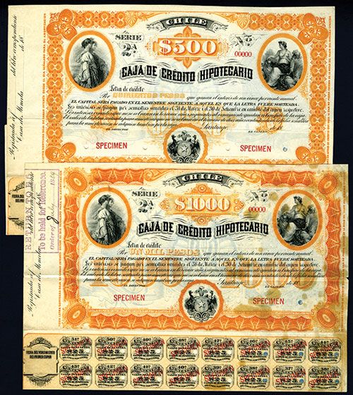 Chile, 18xx, $500, Series 2 5% Specimen Bond, Black on orange border and underprint, “Reaper “ vignette on the left and sitting allegorical woman on the right and country seal on the bottom, POC's and red SPECIMEN overprints, VF condition, ABNC.