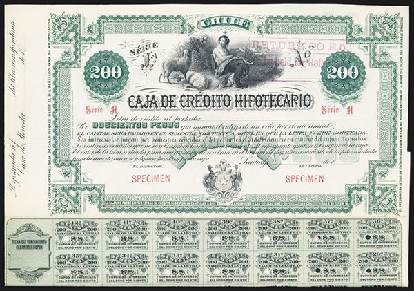 Santiago, Chile, 1--- (ca.1890-1900). 200 Pesos. Ser.A/1A. 8% Bond. Green border and undertint. Seated allegorical reaper with sheep. Red SPECIMEN overprints and POC's. Coupons attached. VF-XF condition. ABNC.