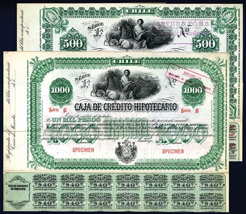 Chile, ND, 1000 Pesos & 500 Pesos, Series A 8% Specimen Bond, Black on green border and underprint, Lady sitting on wheat holding a sickle and lambs beside her, POC's and red SPECIMEN overprints, VF condition lot of 2.