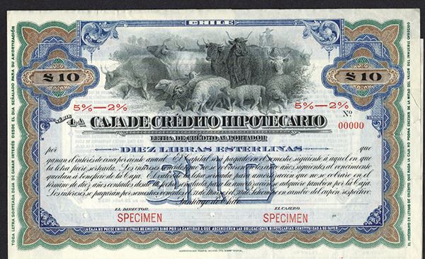 Chile. $10 Specimen 2%-5% Series 4A Bond. Black print with a multi color border; brown, green, and blue, with a blue under print. Vignette of steer and cattle at top of certificate with the farmer barely visible behind them. Certificate is written in Spanish, Specimen overprints, POC's, XF condition with all coupons attached, ABNC.