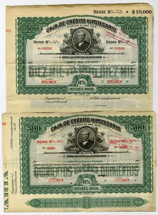Santiago, Chile, ca. 1900-30s. Lot of 2 Specimen 8%-1/2% Coupon Bonds in Spanish: 500 Pesos in green; and 10,000 Pesos in green. Both have red specimen overprints, 00000 serial numbers, and POCs. VF condition, ABNC.
