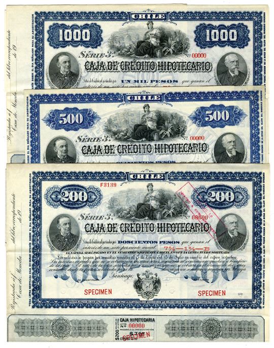 Santiago, Chile, ca. 1900-30s. Lot of 3 Specimen 7%-1% Coupon bonds in blue: 200 Pesos; 500 Pesos; and 1000 Pesos. All have red specimen overprints, F1915 serial numbers, and POCs. VF condition, ABNC. (3)