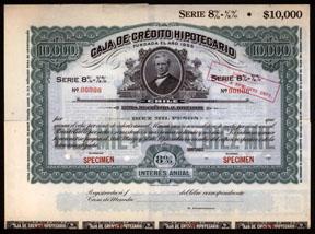 Lot of 4 bonds, all from the same series, Santiago, 19xx. Series 8%-1/2% all with green border and portrait of distinguished gentleman vignette, $500, $1,000, $5,000 and $10,000 ABNCo. Specimens with coupons, VF, scarce set of Chilean bonds.