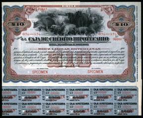 Santiago, 19x , œ10. Sereis 4A 6%-1% bond, Lilac border with animal vignette. ABNCo. Specimen with coupons, EF, back has text stating that the bond's coupons that are not redeemed within 5 years will be confiscated by the Caja.