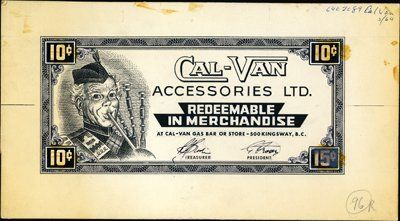 B.C. Canada. 1964. 10 cents Model or mockup of proposed scrip note with border and denominations pasted on to board. Original ink drawing of bag-pipe player on left wit hand drawn title and text. 13.5 by 7.5 inches. Probably from ABNC or Canadian BNC archives. Unique in archive. XF condition with some paper stains on the upper right. ABNC, CBNC.