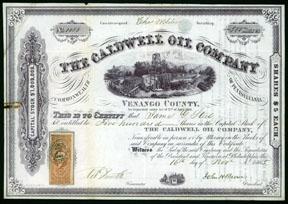 Pennsylvania. 1865. 500 Shares, Cert.#1086, Purple Border, Oil Drilling Vignette, Issued and uncancelled, Revenue Stamp Attached. Paper clip stain on left border with small hole from rust oxidation. Scarce and attractive Pennsylvania oil company stock.