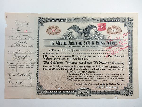 Los Angeles, CA., 1 Shares, I/C, Black with light brown underprint, eagle vignette, Ink cancelled, S/N 15, Small chip and 2 small 1/2 inch tears on bottom right margin, still a very scarce and rarely seen Western rail.