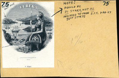 ca.1880-1953. 2 different proof vignettes including a Unique error Proof of California State Arms or Seal vignette. 1). Error state seal has 32 stars engraved when there should have been only 31 stars. Notation on manila card states "Note! Should be 31 stars, not 32. Admitted to Union 31st State". 2). California state seal by Franklin BNC. Scarce pair. Unc. FBNC.