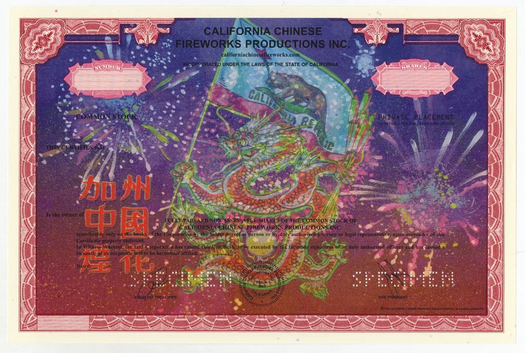 China & California. Odd Shares Specimen Stock Certificate, Black print on red border with colorful firework display of Chinese dragon holding California flag, Pin punched Specimen, VF-XF condition, Banknote Corp. of America.