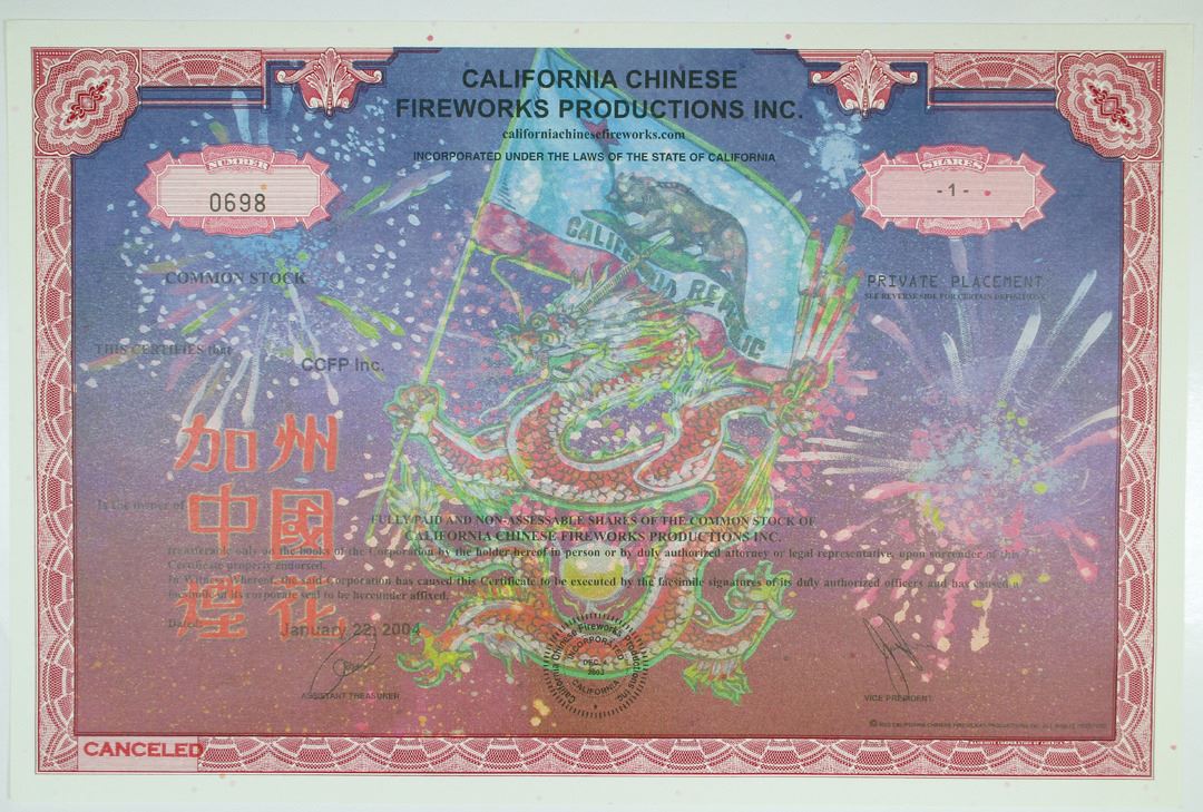 California, 2004. 1 Share I/C Stock Certificate, Black text with red border and very colorful background, with Chinese characters and a dragon holding California's state flag and fireworks. Cancelled stamp at bottom left corner. VF condition.