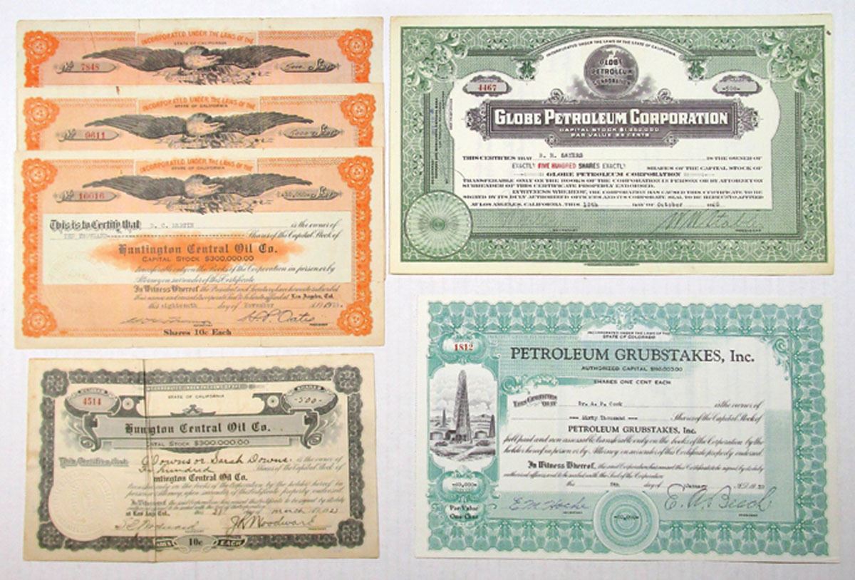 California & Colorado, 1921-39. Lot of 6 I/U Stock Certificates from various companies, Includes: Huntington Central Oil Co. (4), Petroleum Grubstakes, Inc., and Globe Petroleum Corp., Certificates range from Good to Fine condition. (6). Sold "AS IS" no returns accepted.