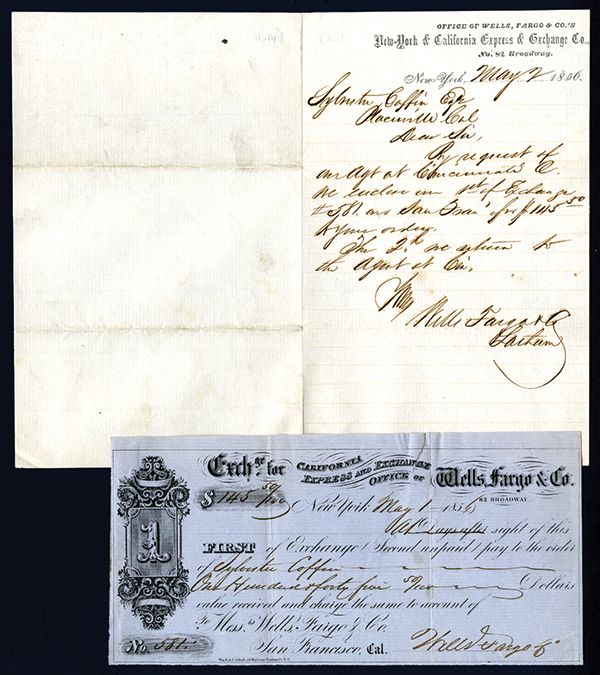 California Express and Exchange office of Wells, Fargo & Co. 1856 Gold Rush Era First of Exchange and Letter. New York, 1856, First of Exchange, $145.50, S/N 581, Black on thin blue paper with ornate "1" counterfoil on left, ornate title, payable at their offices in San Francisco, VF condition with small tear and stamp hinge repairs on reverse. Also included is a handwritten confirmation letter for the same bill of exchange letterhead of "Office of wells, Fargo & Co., New York & California Express & Exchange Co.".