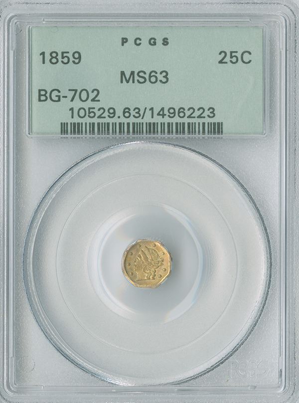 California Fractional 25c, 1859, Octagon Liberty gold PCGS graded MS63, BG-702, Slab# 10529.63