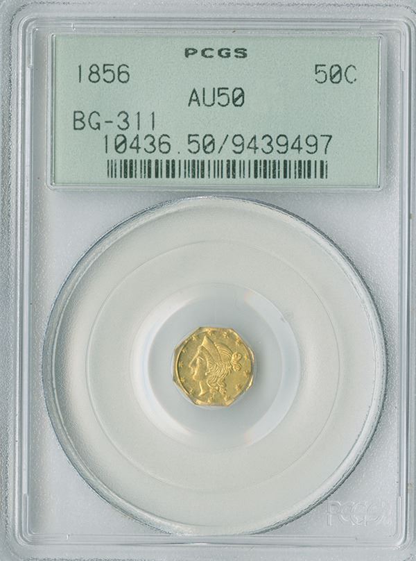 California Fractional 50c, 1856, Octagon gold, PCGS graded AU50, BG-311,Slab# 10436.5