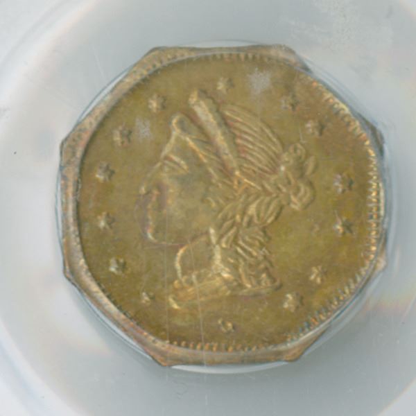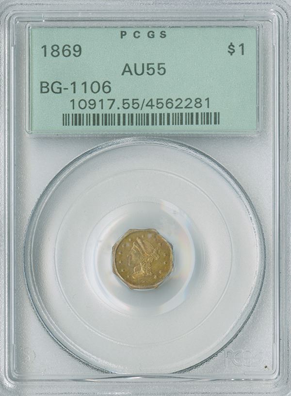 California Fractional Gold Token $1, 1869, gold, PCGS graded AU55, octagon, BG-1106, Slab# 10917.55
