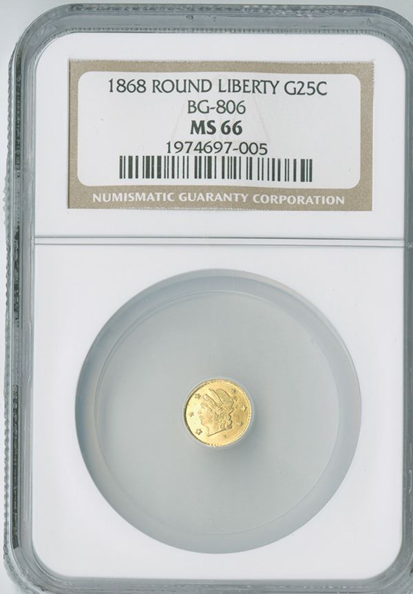 California Fractional 25c, 1868, gold, NGC graded MS66, BG-806, Slab# 1974697-005
