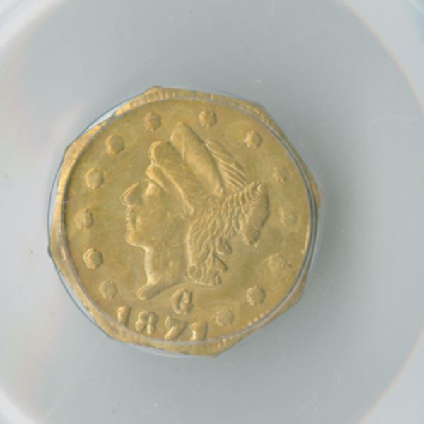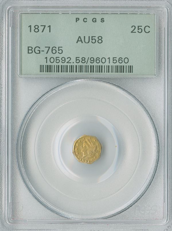 California Fractional 25c, 1871, gold PCGS graded AU58 BG-765, ex Heifetz (Russian Violinist) coin, Slab# 10592.58