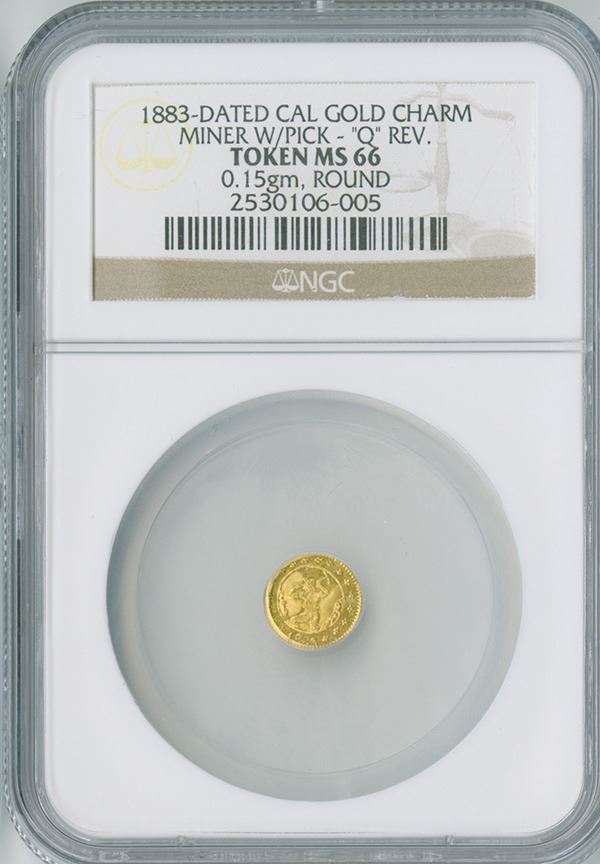 California Gold Charm Token Round, 1883, Miner with pick, "Q" Rev. gold, NGC graded MS66, 0.15gm, Slab# 2530106-005