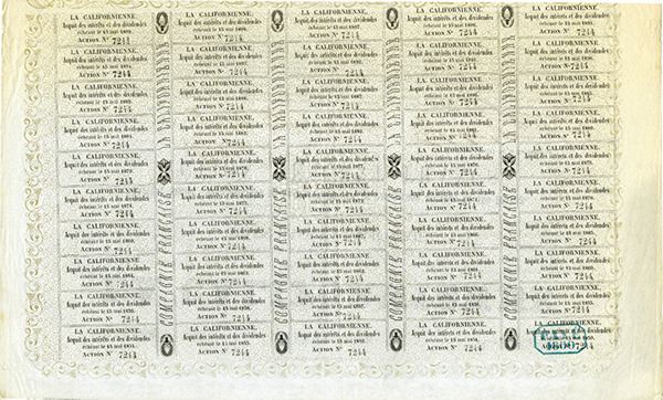 California and France. Lot of 2 Gold Mining stock certificates dated 1850, both in French and issued in France. Includes Le Mineur, Compagnie Franco-Californienne Des Mine D'Or De La Californie, 1 Share - 10 Francs, Black printing on small format certificate; also includes Le Globe, one of the earliest California Gold Mining stock certificates, 1 Share = 10 Francs, both in VF to XF condition. early and rare California Gold Rush stock certificates.