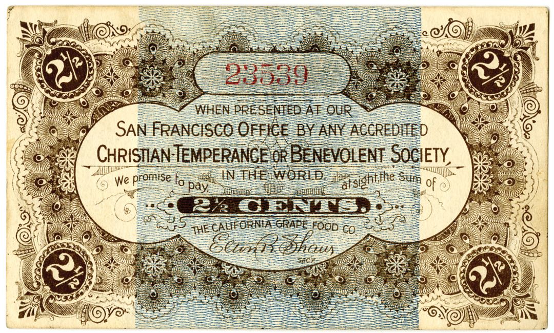 San Francisco, California, ND (1880-1900). 2 1/2 Cents California Grade Food Co. Scrip Note, Brown printing with blue underprint, Back is green with Non-Alcoholic Trade Mark at center, S/N 23539, XF.