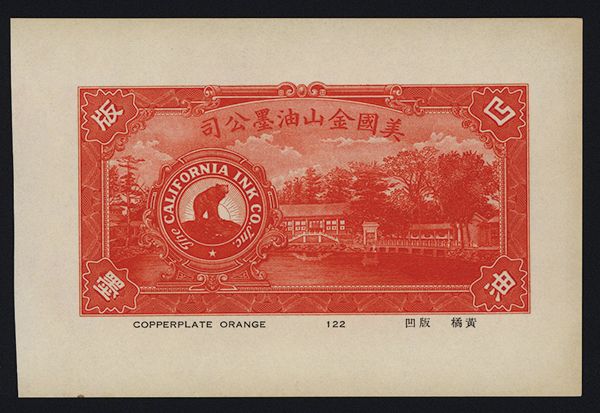 ND (ca.1910-20). Chinese sample banknote used as color sample. "Copperplate Orange - 122". California state "Bear" on left in oval on top of the face of a Chinese banknote with home or temple on river or lake. Back is blank. AU to Uncirculated condition. Rare color sample note using Chinese banknote facsimile. The note is intaglio printed. The printer is not listed.
