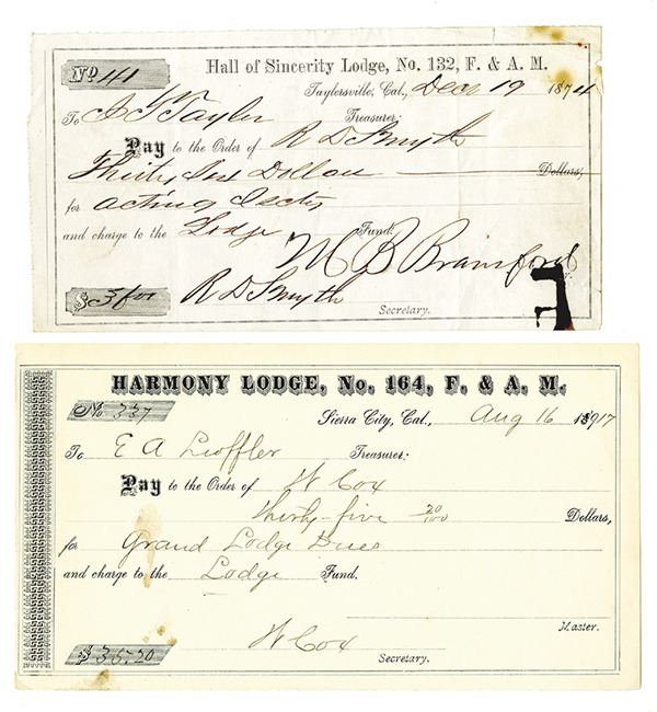 Sierra City, CA., 1917, Harmony Lodge, No.164, F.& A.M.; and, Taylorsville, CA., 1874, Hall of Sincerity Lodge, No.132, F.& A.M. check, both plain designs, VF condition.