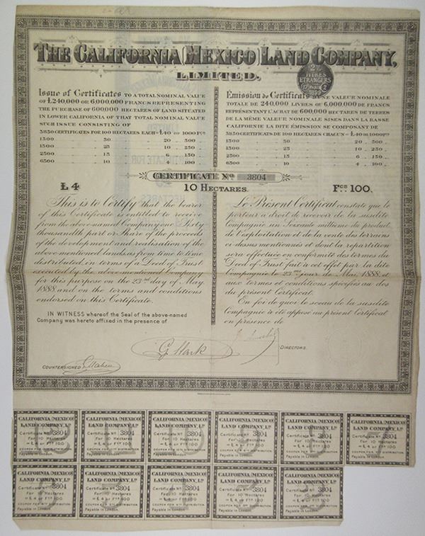 California & Mexico. Issued Certificate for 10 Hectares of Land = 100 Francs, Black print on black border printed in English and French, Company title at top, Fine-VF condition, Coupons on bottom, VF with toning. W&S.