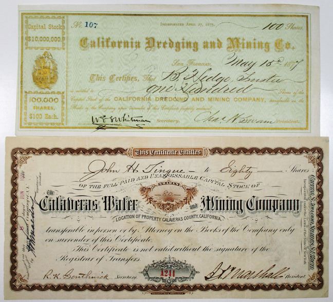 California Lot of 2 pieces, Includes: California Dredging and Mining Co. 1877 100 Shares I/U Capital Stock Certificate, S/N 107, in gold and green; and Calaveras Water and Mining Co. 1881 80 Shares I/U Capital Stock Certificate in brown with the Location of Property in Calaveras County, California. Both are in VF to XF condition with some toning. (2)