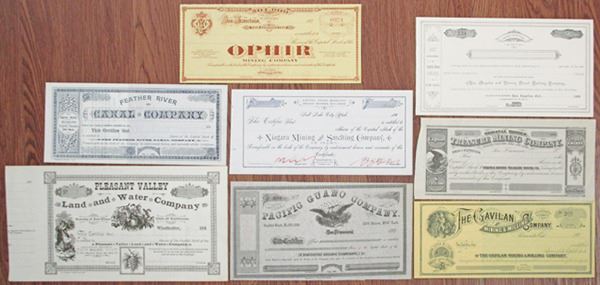 CA. NV. UT...... ca.1860-1920. Group of 8 stock certificates, highlights include: Cavilan Mining & Milling Co. U/U Capital Stock Certificate; Original Hidden Treasure Mining Co. U/U Capital Stock Certificate; Feather River Canal Co. U/U Capital Stock Certificate; Niagara Mining and Smelting Co. of Idaho U/C Capital Stock Certificate; and Pleasant Valley Land and Water Co. U/U Capital Stock Certificate (8)
