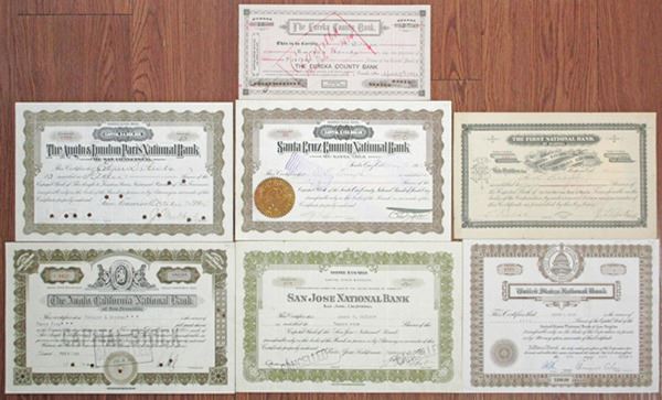 NV and CA.... 1890-1936. Lot of 7 stock certificates from Western United States banks, highlights include: Eureka County Bank 15 5/13 Shares I/C Capital Stock Certificate; Santa Cruz County National Bank 25 Shares I/C Capital Stock Certificate; First National Bank of Madera 1 Share I/C Capital Stock Certificate; and San Jose National Bank 24 Shares I/C Capital Stock Certificate. All are in Fine-VF condition. (7)