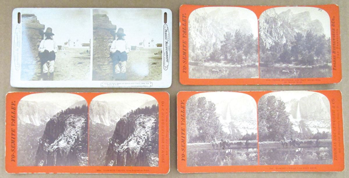 California & New Mexico. Lot of 4 Stereo views Photographs, 2 images per card: Includes stereo view of New Mexico, Old Pueblo Indian and Spanish adobe Church in Isleta New Mexico; Yo-Semite Valley images of Inspiration Point, Yo-Semite Falls, and Three Bothers Peak. XF condition. (4).