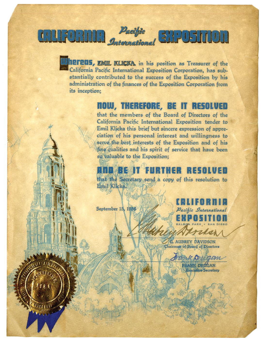 California, 1936. Certificate of Appreciation issued to Emil Klicka for his "willingness to serve the best interests of the Exposition" and service to the success of the Exposition. Signed by G. Aubrey Davidson as Chairman of Board of Directors, and Frank Drugan as Executive Secretary. Blue text with blue Exposition underprint, Printed on brown paper, Gold embossed seal with ribbon at bottom left corner. Fine condition with a small hole near center left margin, and some toning. The California Pacific International Exposition was an exposition held in San Diego, California during May 29, 1935 - November 11, 1935 and February 12, 1936 - September 9, 1936. The exposition was held in Balboa Park, San Diego's large central urban park, which had also been the site of the earlier Panama-California Exposition in 1915. The Exposition was held to promote San Diego and support its economy, which had slowed with the country's Great Depression. The first year was such a financial and attendance success that it was held over for a second year. The exposition had hundreds of exhibits on history, the arts, horticulture, ethnic cultures, science, and industry.