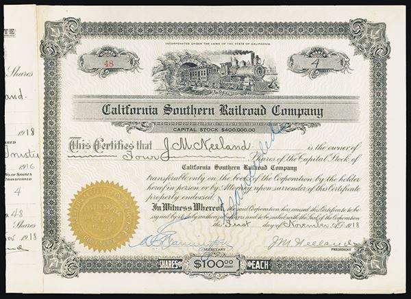 California, 1918, 4 Shares, issued and ink cancelled, Black border on gold underprint, Locomotive leaving tunnel, Cert.#48, VF condition. Rare railroad in Cox.