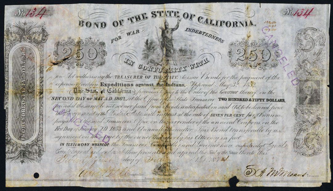 California, July 21st, 1854, $250, Issued and ink cancelled bond for "Expeditions Against the Indians", Black with no underprint, Native American with bow and arrow on top middle with George Washington on right, Split vertically down the middle and repaired leaving a light glue stain in middle, Small holes in middle left, a small hole near the signature block on the lower right margin and minor edge faults, but still a very rare and popular early California Bond in VG condition. Cert.# 134, Signed by treasurer and comptroller. Fishbourne's Lith, SF.