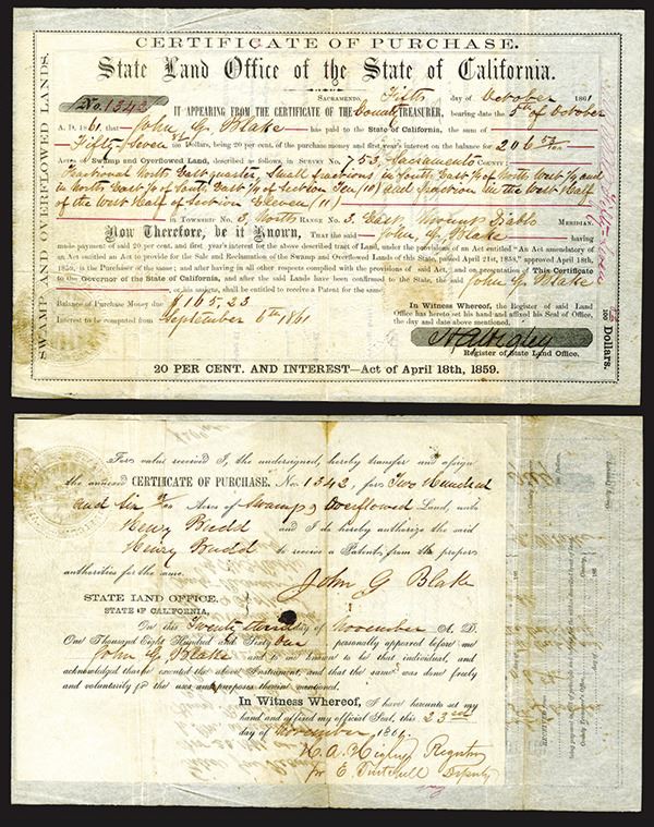 Sacramento, California, 1861. Certificate of Purchase of Swamp and Overflowed Land from the State Land Office in California, issued for $57 with 20% of first year's interest on 206.33 Acres of land in Sacramento County. An Act was passed in 1858 for the sale and reclamation of swamp and overflowed lands in the State of California. "East Mount Diablo Meridian" used in the coordinates of the property location. Attached to the back is a Certificate of Purchase made out to Henry Budd. VF condition. Certificate # 1342. Scarce and early Gold Rush related document.