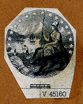 ca.1850's-1870's. 4 different vignettes of California state seals. All are printed on india paper and mounted on manila file folders. Printers include NBNC, BCC and unattributed. Condition varies from Fine with slight glue staining to Choice uncirculated condition. Early California arms or seals.