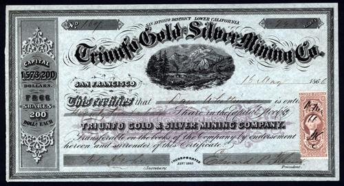 California, 1866, $1000, Horizontal Issued Capital Stock, 5 cent revenue stamp attached, Black border with mountain and mills, purple underprint, XF.