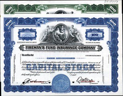 ca.1930-60's. 100; Odd Shs. 3 different stock certificates, 2 are specimens and one a proof. 1,2). Fireman;s Fund Insurance Co., California. Vignette of Fireman holding little girl with raging fire in background. One is a proof and the other is a specimen. 3). Firemen's Insurance Company of Newark, New Jersey. NJ Arms. VF to XF condition. SBNC.