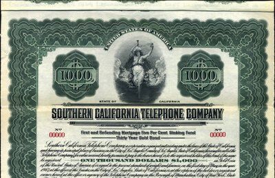 1917. $1,000. Specimen 1st Mortgage 5% Gold Bond. Green border. Allegorical women holding old fashioned phone. Coupons attached. Red specimen overprints, POC's and "00000" serial numbers. XF condition. Rare California telephone bond. ABNC