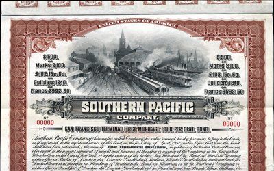 International bond. 1910. $500; Marks 2100; 102 Pounds. 15s.6d; 1240 Guilders; Francs 2592.50. Specimen San Francisco Terminal 1st Mortgage, 4% Gold bond. Red-brown border. Trains in train yard. XF condition. Red specimen overprints, POC's and "00000" serial numbers. Coupons attached. Payable in 5 different currencies. Rare European bond use. Countries include Germany, England, France, Holland and the U.S. Rare certificate. ABNC.