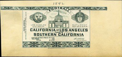 Nov.30, 1940. "Football - Los Angeles Memorial Coliseum - California at Los Angeles Versus Southern California; Saturday Nov.304, 1940; 2:15 PM; Est.Price $3.00 Tax Paid .30, Total $3.30 - Gate Check". Proof ticket printed in green on white thin paper mounted on manila card stock. Order or plate number "1542" on top. Printed by Jeffries Banknote Co., Los Angeles. Vignette of the Coliseum clock tower with "Bruin" bear on top left and "Trojan" soldier on top right. Famous California cross town rivalry football ticket. XF condition with margins cut close to border. Unique in archive. JBNC